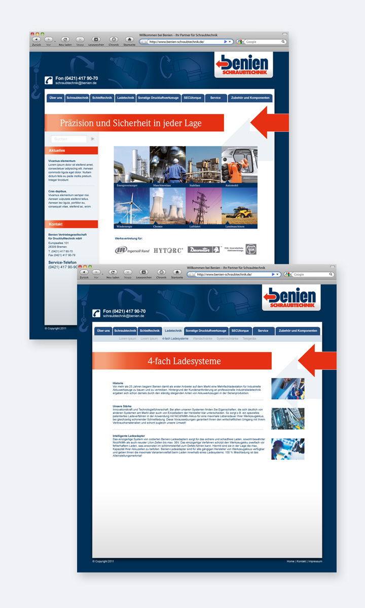 Entstanden bei attentus, Bremen: erste Entwürfe für die Website von Benien Schraubtechnik