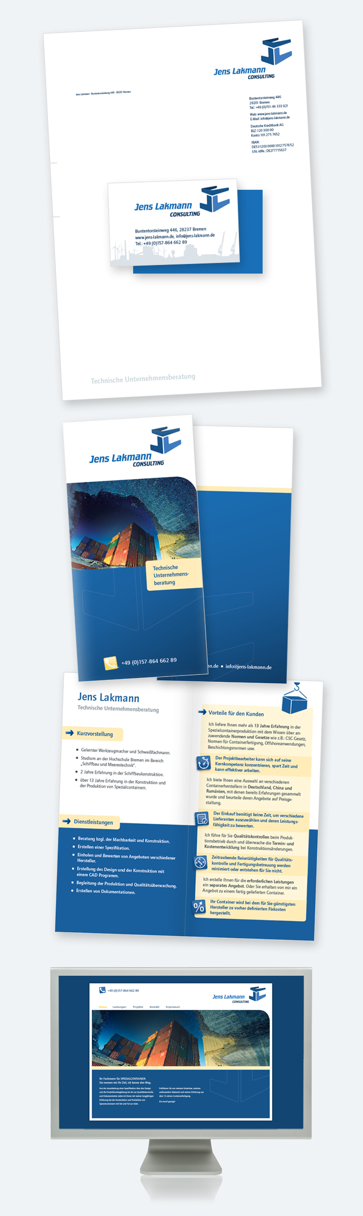 Neues Erscheinungsbild für die Firma Jens Lakmann Consulting mit Logoentwicklung und Geschäftsausstattung sowie einer Website (Adobe Dreamweaver)